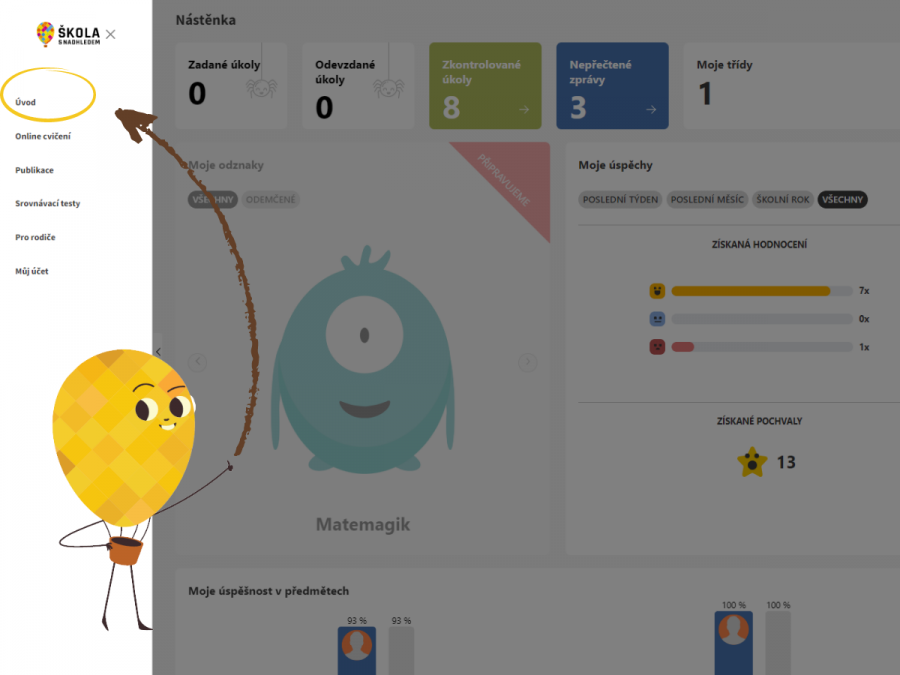 Vítejte na Vaší nové NÁSTĚNCE. Pro návrat na Úvodní stránku klikněte na logo Školy s nadhledem v levém horním rohu obrazovky a vyberte ÚVOD.